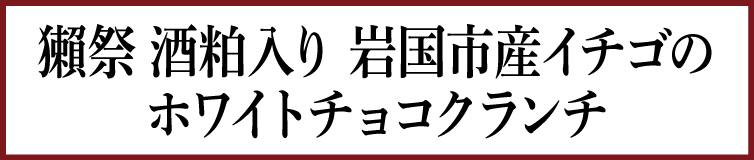 商品ラインアップ 獺祭 酒粕入り 岩国市産イチゴのホワイトチョコクランチ Local Strawberry White Chocolate Crunch with Dassai Sake Lees 黒糖と獺祭の酒粕入りの芳醇な味わい、クランチのサクサク食感が楽しめる 岩国産のドライ苺の酸味と、ホワイトチョコの甘味のハーモニー。そして、黒糖に加え、獺祭の酒粕パウダーを隠し味に使い、芳醇なコクと香りが楽しめる大人のお菓子に仕上げました。 岩国れんこんチップス うす塩味 Iwakuni Lotus Root Chips Light Salt Flavor カリッと香ばしくれんこんの甘み広がる 岩国れんこんは、普通のれんこんより1つ穴が多い、9つの穴のものがよく見られます。そのため、見通しが利く、縁起のよい食材として親しまれてきました。日本酒のつまみに、パリパリ止まらない、素朴なおいしさをどうぞ。 岩国れんこんチップス わさび醤油味 Iwakuni Lotus Root Chips Wasabi Soy Sauce Flavor れんこんの香ばしい甘みと、わさびの辛みの、おいしいバランス カリッと香ばしい岩国れんこんのチップスに、岩国産のドライわさびの葉をサッとまぶして仕上げました。日本酒によく合う、ピリッとクセになるおつまみの逸品です。 岩国れんこん福神漬 Iwakuni Lotus Root Pickles 老舗「うまもん」の昔ながらの手づくり醤油漬 うまもんは、作家の宇野千代さんにも愛された、創業300年の歴史を持つ岩国の漬物屋さん。いわゆる福神漬とはちがう、旨みたっぷりの野菜の醤油漬を召し上がれ。 いわくにマロンラスク Iwakuni Chestnuts Rusk 岩国名物「岸根ぐり」の甘みと、香ばしいバター醤油のマリアージュ ラスクの両面に、岩国名物の「岸根ぐり」とバター醤油のペーストをたっぷり塗って、おいしく焼き上げました。上品な甘さと香ばしさ、そしてバゲットのサクサク食感に、不思議と日本酒が進みます。 四川風クリスタル辛涼麺(しんりょうめん) Sichuan style Crystal shin-ryo-men 豆豉の旨みと香りにラー油の辛みがきいた本格四川風のタレが絡むヘルシーなこんにゃく麺 錦川水系の地下天然水から作られた、もちっとしたこんにゃく麺に、旨みと辛みがほどよい、ピリ辛の四川風タレを掛け合わせた新食感のおつまみです。風味豊かな味わいは、やみつきになること間違いなし。 高森牛と岩国れんこんのしぐれ煮 Stewed Takamori Beef & Iwakuni Lotus Root 蜂蜜店のクッキングハニーと生姜で、じっくり煮込んだ特上の味わい 高森牛は、岩国のおだやかな自然の中で、飼料にもこだわって大切に育てられています。その肉質は、芳醇で香り豊か。シャキシャキ食感の岩国れんこんとともにどうぞ。 高森鶏と根菜たっぷりのキーマカレー Keema Curry with Takamori Chicken and Root Vegetables 蜂蜜店のクッキングハニーと岩国産のマイヤーレモンをかくし味に使った、サプライズなおいしさ 周防高森どりの旨みと根菜の食感をいかした、おつまみキーマカレー。そのままでも、クラッカーにのせても、野菜スティックにつけてもおいしく召し上がれます。 天然鮎の甘露煮 Salty-sweet Natural Ayu 錦川の天然鮎を、岩国伝統の甘辛い煮つけで 錦川の水の美しさは、そのまま、鮎のおいしさを物語っています。天然鮎の甘露煮の甘辛い味付けと、岩国の日本酒の清らかなおいしさは、相性抜群です。 天然鮎の素焼き Grilled Natural Ayu 錦川の清流が育んだ、鮎本来の旨みを香ばしく 何ひとつ味をつけていない、天然鮎の素焼きです。素朴なおいしさをそのままでも、七味マヨネーズをつけても。日本酒の熱燗に炙った身を入れると、通好みの鮎酒に。 ※当商品は自然の恵みである清流錦川の天然鮎を使用しております。そのため、季節や漁獲状況によっては、販売をお休みさせていただく場合がございます。あらかじめご了承ください。 スルメも驚くメンマ Menma Is Surprised Even The Dried Squid スルメのように噛むほどにおいしい岩国の幼い竹で調理したメンマ 岩国の豊かな土壌から生まれた幼い竹を、醤油、みりん、りんご酢、生姜等で煮詰め、照り焼き味に仕上げました。メンマをスルメイカのように楽しめる、今までにない珍味の誕生です。 はちみつレモンどら焼き Honey Lemon Dorayaki 白あんに、はちみつ、レモン果汁、レモンの皮を合わせた、さっぱり甘味 ふっくらと焼き上げた皮の中身は、岩国名産のはちみつや、瀬戸内の温暖な気候が育てたレモンの果汁や皮を混ぜた白あん。甘みをおさえた爽やかな風味で、日本酒とのマッチングも抜群。 ぎゅっとドライトマト Freeze-dried Midi Tomato 赤く熟した後に採った由宇のミディトマト、噛むほどに甘みがあふれ出す たっぷりと時間をかけて蓄えられた糖分や旨味が、噛んだ瞬間あふれ出す。そんな由宇とまとを使用したドライトマトのおいしさは、特別。 輪切りドライトマト Slice-dried Tomato 赤く熟した後に採った、由宇とまとの甘みをぎゅっと凝縮 瀬戸内の温暖な気候が育てた由宇とまとを使用。甘さの秘密は、赤く熟した後に収穫する「赤熟採り」を採用しているから。ひとかけらを冷酒に入れると、トマトの旨みがグラスに広がります。 こくうま